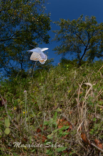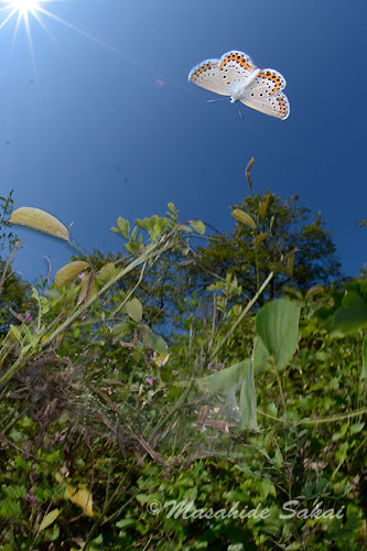 保全生息地の土手をチラチラと舞うきれいな個体を狙う。