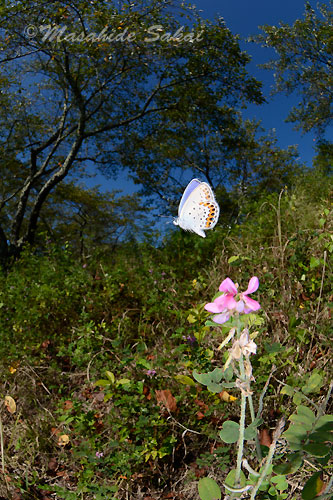 翅の表の青色も良いが、翅の裏の外縁に並ぶ燈色斑は