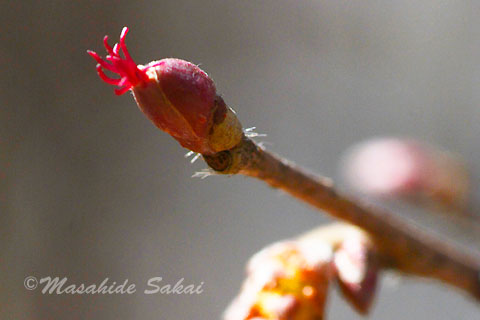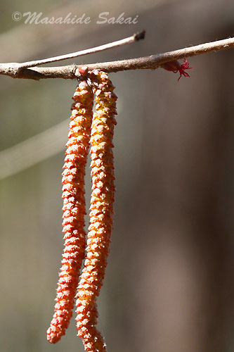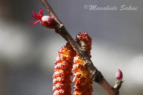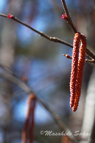 ツノハシバミの花が咲き始めた。花の総は雄花で、枝先や雄花の近くには、