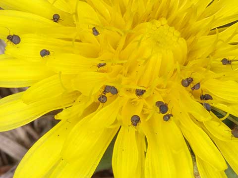 林際のタンポポを見て歩くと,小さな小さなトビムシがたくさんいる花が多い。 この土色の丸い体のトビムシは,体長は1ミリに満たない大きさ。 左は,今日持っていたレンズの最大倍率での撮影。右は,部分拡大したもの。ちゃんと目や足がある。