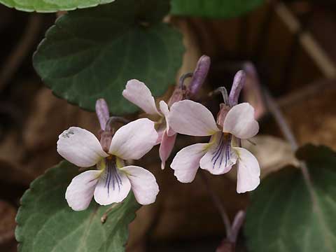 里山には多くのスミレが咲き乱れるようになった。 左は,ゲンジスミレのようだが,花びらのスジがない。亜種なのだろうか。 右は,その名もスミレ。一番なじみのある花だ。