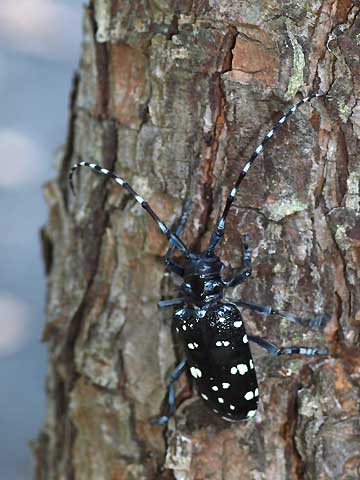 しばらくすると,もう一匹のゴマダラカミキリがやって来た。 けんかをするでもなく,別々の方向に分かれて行く。 お互いにさけているように見られる。 近くの小さな松の木に登ってまた動かなくなった。