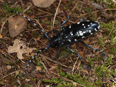 白樺にゴマダラカミキリを見つける。 撮影しているとぽとりと落ちて地面に食いついたようなポーズ。 何をしようとしているのだろうか。