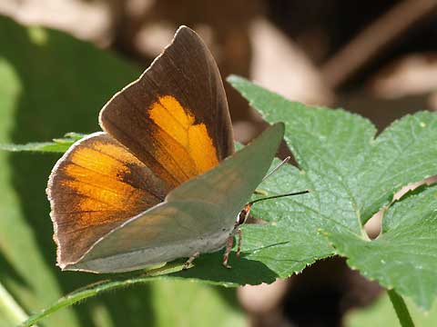 秋型のウラギンシジミが羽化し始めた。 夏型の丸みのある羽に対して,秋型は,羽の先が尖る。 今日は,オレンジ色の華やかなオスと, ちょっとシックな薄紫色のメスの両方が見られた。 なぜか私はメスの色合いの方が好きなのだが, 皆さんはどちらが好みかな?
