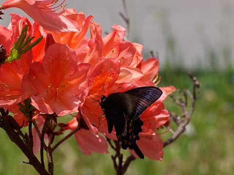 ツツジの花にアゲハチョウが来るので,待ち伏せすることにした。 まず現れたのは,カラスアゲハのメス。 きれいな個体だ。