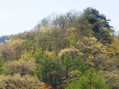 遠くの山肌も,コナラやクヌギの芽吹き色が目立つようになった。