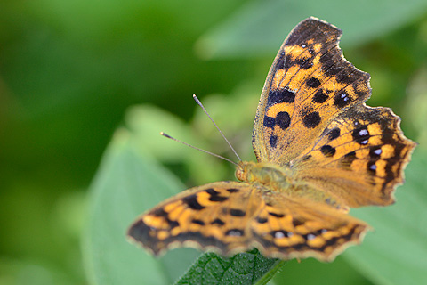 キタテハの撮影は,秋から晩秋にかけて花に集まっているものか, 越冬明けに日向ボッコしているものが多いので,ほとんど秋型を撮影している。 今日は珍しく,家の側の草むらに夏型のキタテハを見たので, 早速,家にカメラをとりに行ってきて撮影した。 さすがに夏型の羽の色は,キタテハの名前の通り,黄色が強い色だ。 黄色が強いので青い紋も映えて見える。黒い紋も鮮明だ。