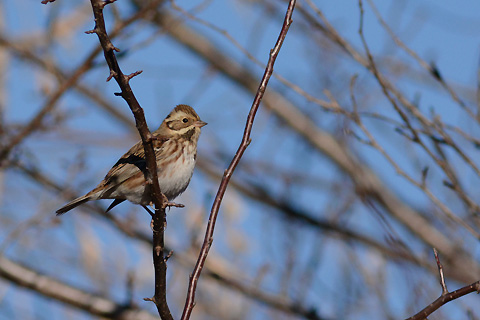 カシラダカが,スズメの群に混じって行動していた。 冬の間,カシラダカは結構大きな群を作ることがあるのだが, 今年はまだ,カシラダカの群は見ていない。今日もこの2羽。 非常に地味で目立たない小鳥。 スズメの群と一緒に行動していると気がつかない。