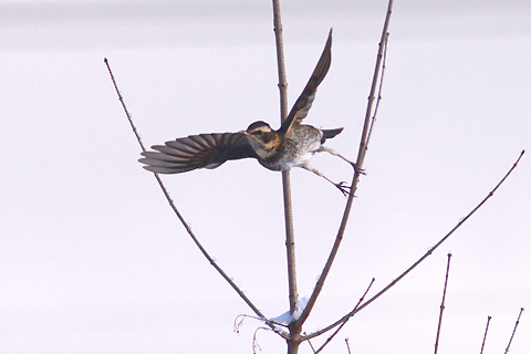 まだ雪が枝の上に残る薮の中に,ツグミの群がいた。 盛んに残された木の実や,冬芽を食べているようだ。 とても活動的で,あちらこちらと飛び回り,鳴き声も大きい。 地面に落ちた木の実をつついている個体もいる。
