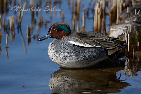 諏訪湖畔のコガモ。 目から首にかけて, 濃い緑色が反射する。 飾り羽もきれいに列んでいる。
