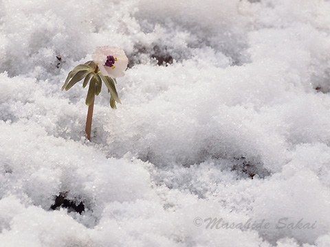 雪が降ったたことで,新たな発見もあった。 今まで,セツブンソウの花弁は,真っ白だと思っていたが, 薄い紅色がかった花弁の株が,ポツポツと観られることが解った。 雪が降り対比できなければ,皆,真っ白だと観ていた所だ。
