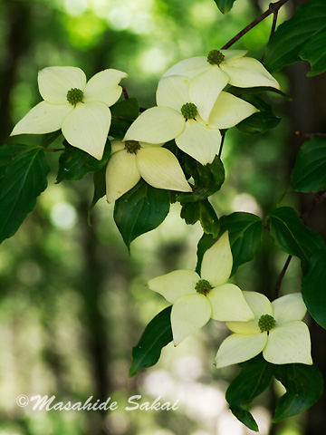 林縁の,大きなヤマボウシの樹が, 枝いっぱいに白い花を咲かせている。 何段にもなるその花の階層は, 一際目立つ存在。