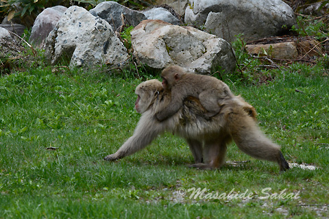 小猿たちは,母猿がゆっくり歩くときは,母猿の背に乗っていることが多いが,